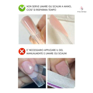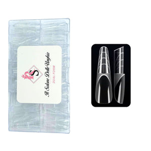 Le Dual Form del ''RS Il salone delle unghie'' sono delle speciali Tips realizzate con materiali di alta qualità, durevoli e riutilizzabili che permettono di ottenere una ricostruzione perfetta in modo ancora più semplice e veloce. A differenza delle classiche Tips, le dual form non vanno incollate direttamente sull'unghia. Si distribuisce il Gel o L'Acrygel nella parte interna della dual, si applica sull'unghia con una leggera pressione facendo attenzione a non creare bolle.
